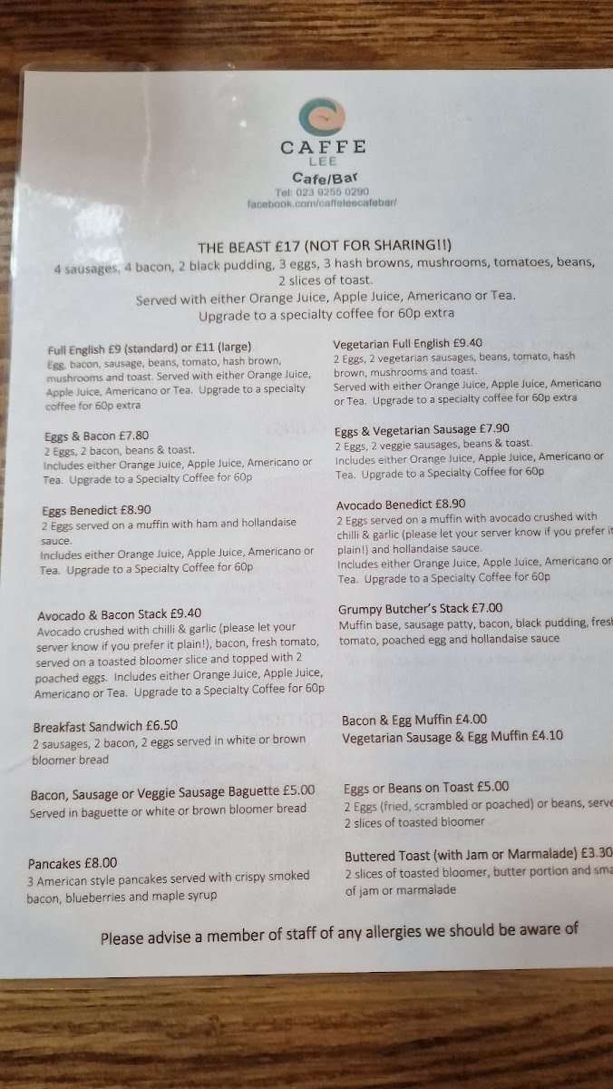 Welcome to Caffe Lee - Cafe/Bar, a delightful culinary gem located at 16 Pier St, Lee-on-the-Solent. This bustling café offers a cozy atmosphere perfect for breakfast or a relaxing afternoon. Patrons rave about the hearty breakfasts, including their renowned 'beast breakfast', which leaves a lasting impression on both locals and visitors alike. The café prides itself on exceptional service, with friendly staff who go above and beyond to accommodate guests, ensuring a warm and welcoming experience.